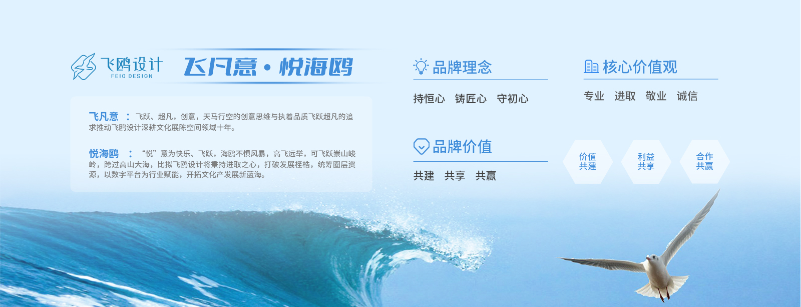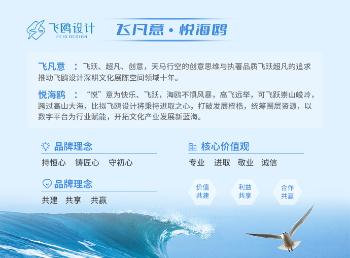 飞鸥设计是助力展陈空间设计者的一站式创业服务平台,为文化产业从业人员提供业务订单、整案模块设计资源、设计培训课程、展陈设计线下交流会、行业动态咨询等服务,以创新思维为设计赋能,开启"共赢共享"设计新时代。